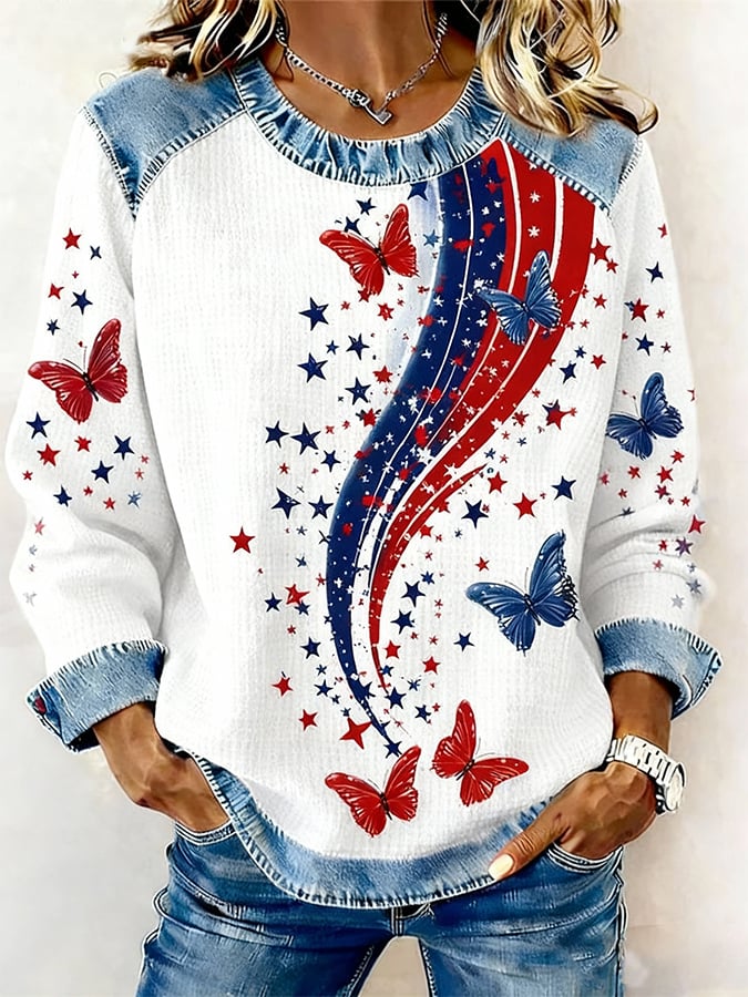 Women's US 250th Anniversary Butterfly & Star Waffle Knit Sweatshirt – Patriotic Denim-Accent Casual Top