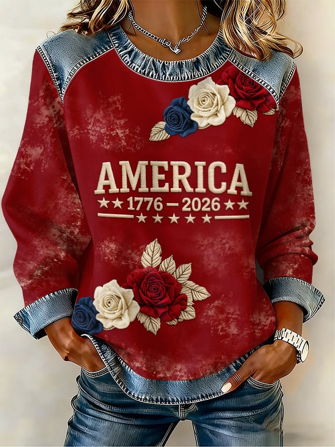Women's US 250th Anniversary 1776-2026 Patchwork Sweatshirt – Floral USA Print Denim-Accent Pullover