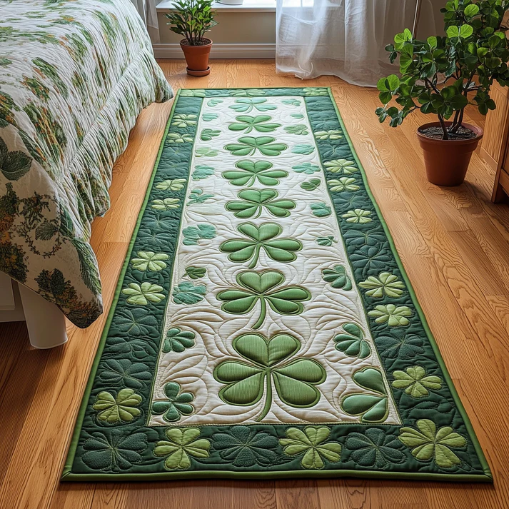 Fresh Farmhouse Style Irish Shamrock & Ombre Green Pattern Quilted Runner Rug with Cozy Rustic Decor | Irish Shamrock