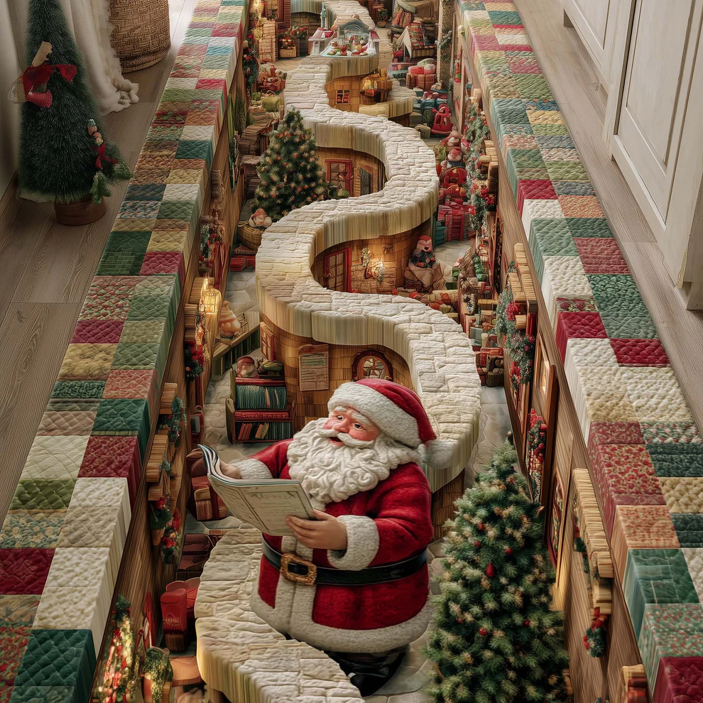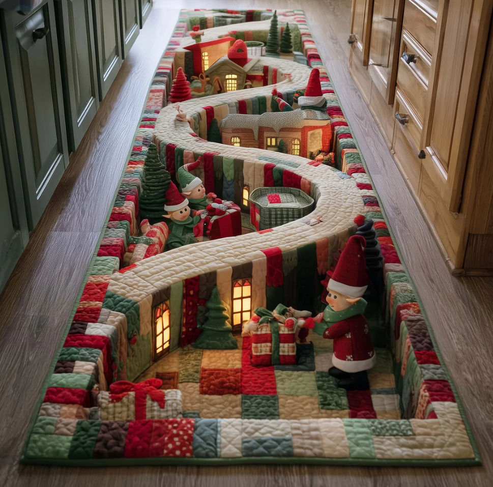 Festive 3D Effect Quilted Jolly Workshop Runner Rug with Illuminated Cottages & Train Track Pattern | Christmas Train