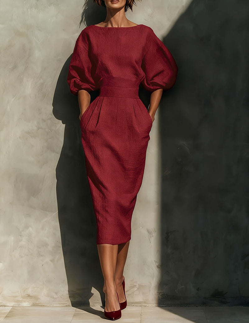 Linen Puff Sleeve Boat Neck Midi Dress Elegant Balloon Sleeve Textured Pleated Dress$54.99 USD$119.99 USD