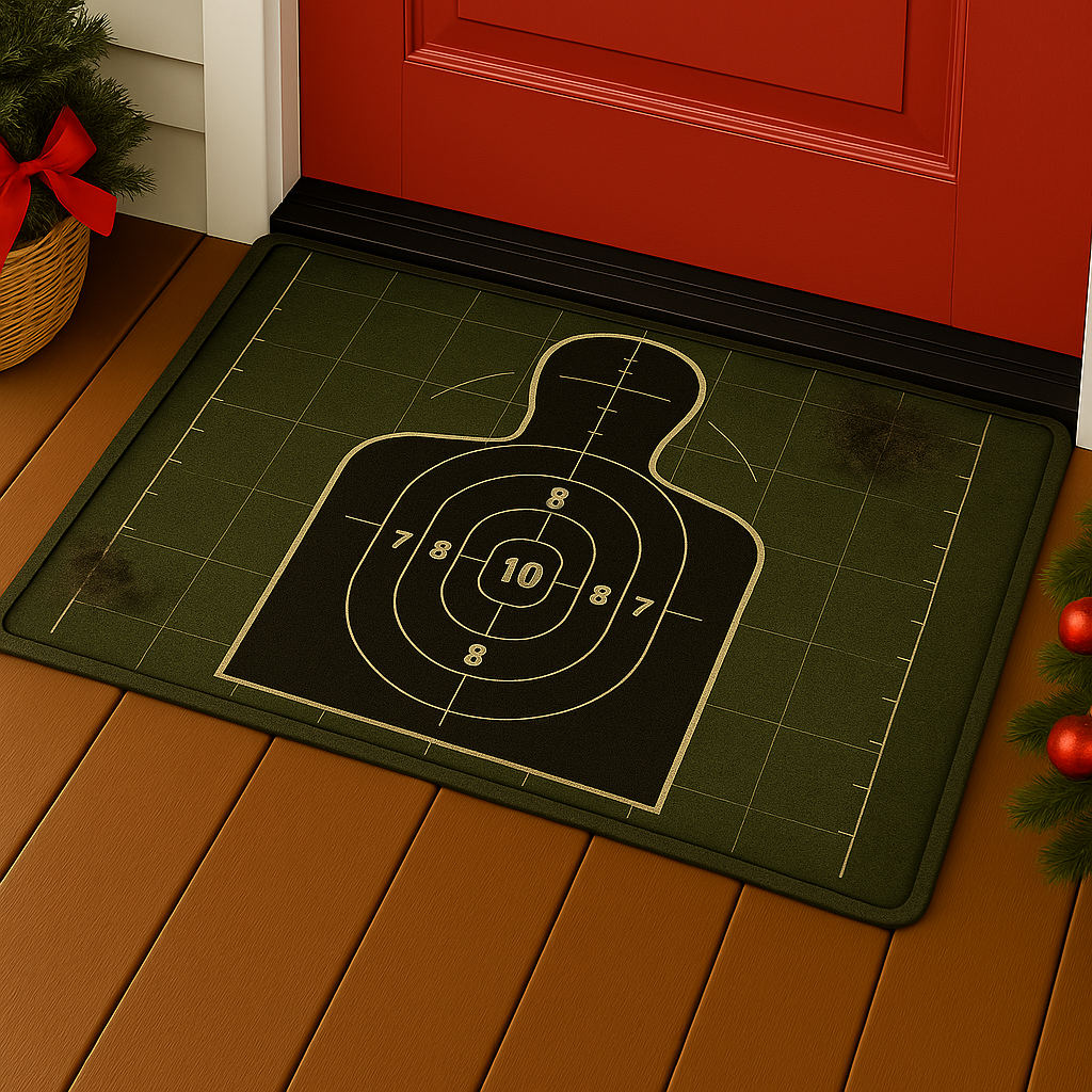 This military-inspired doormat features a bold silhouette target, clear ring markings, and a rugged grid layout—perfect for veterans, shooters, and anyone who loves military aesthetics.