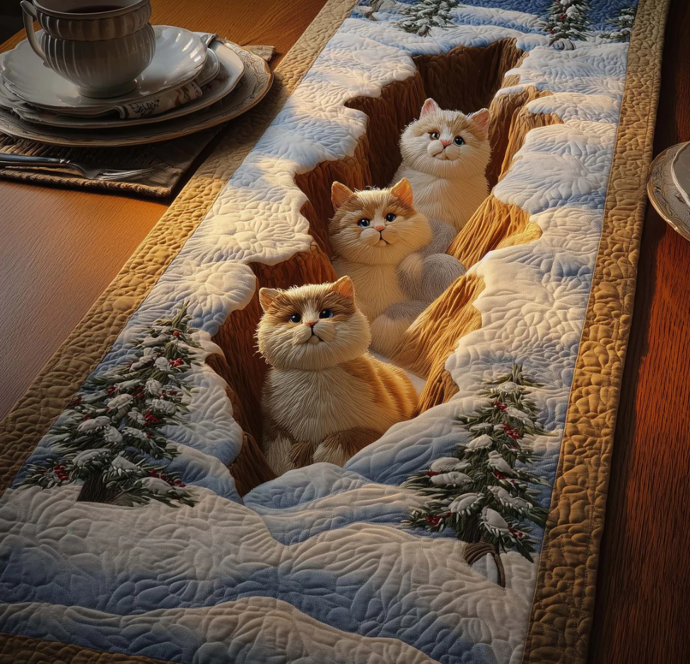 Silent Cats Quilted Table Runner Snowy Forest Cat Family Pattern Dining Table Flag for Home Decor | Cat