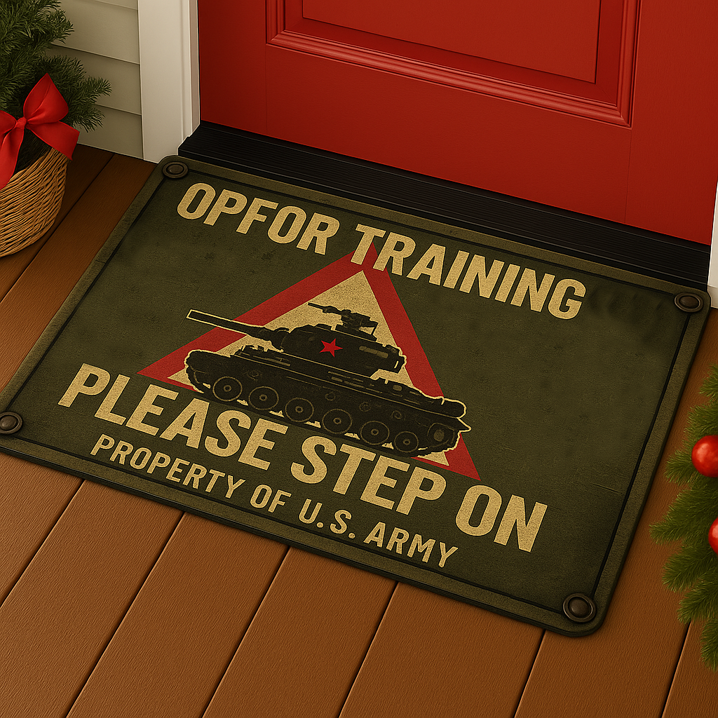 Bring a bold touch of military humor and U.S. Army spirit to your doorstep with this OPFOR Training doormat. Featuring a tactical tank graphic with “PLEASE STEP ON” lettering, it’s the perfect blend of rugged style and playful attitude.