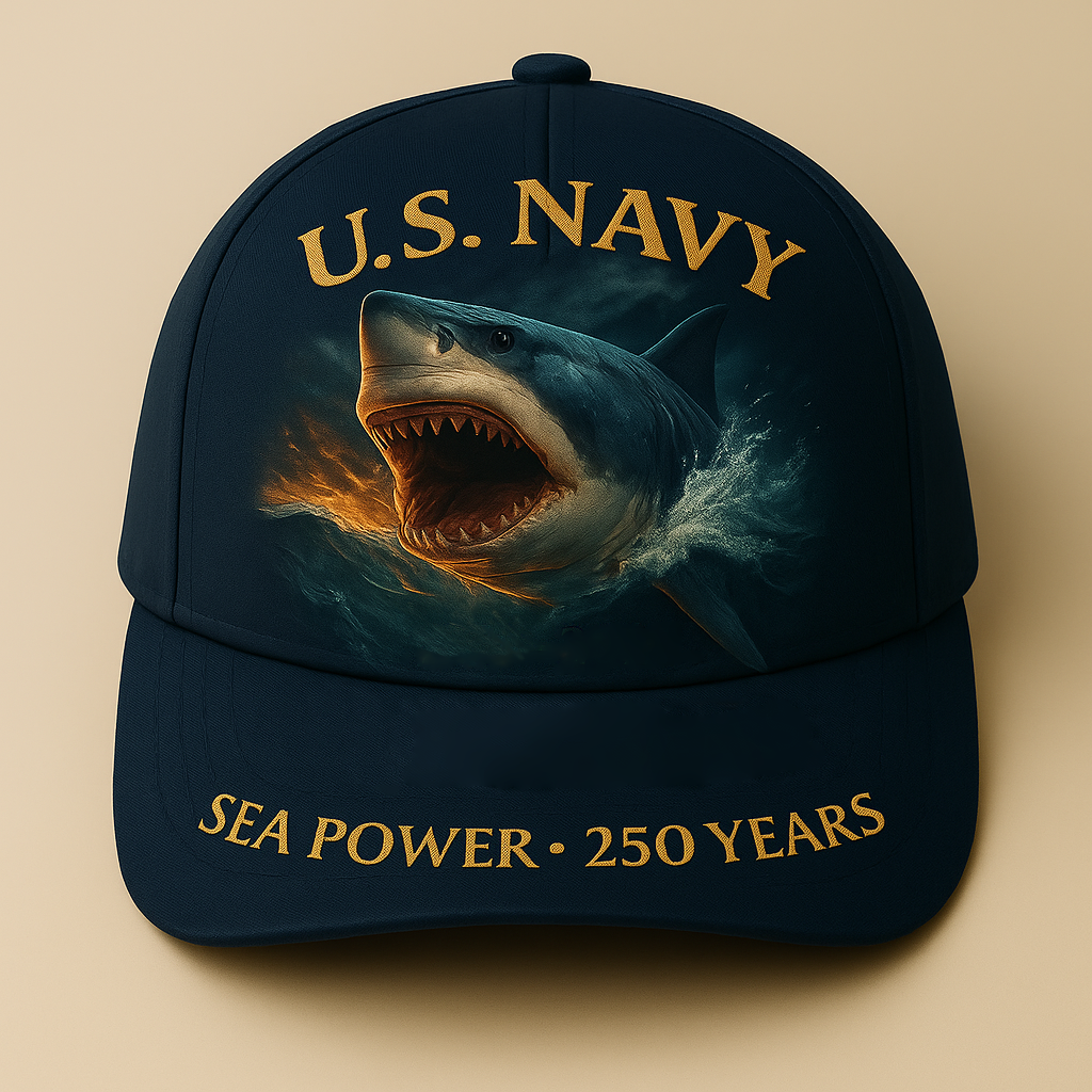 Make a bold statement for the Navy’s quarter-millennium. This deep-navy cap showcases a surging great white with ember glow and spray, crowned by arched U.S. NAVY lettering. The visor reads SEA POWER • 250 YEARS—a clean, high-impact tribute for sailors, veterans, and proud supporters.