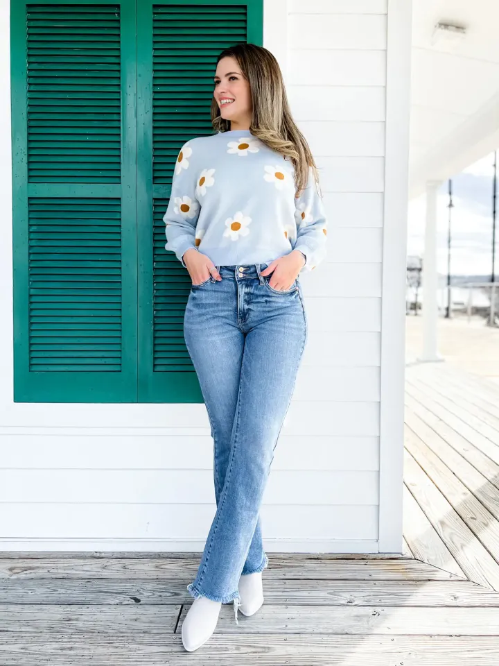 The frayed hem gives the jeans a vintage, lived-in appeal. This touch of ruggedness pairs perfectly with the sleek bootcut shape, balancing sophistication with casual edge.