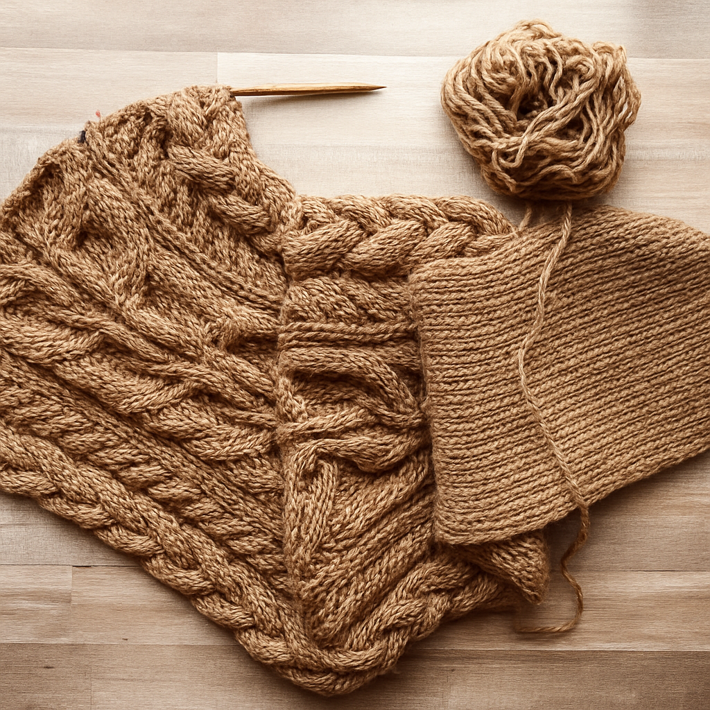 The sweater scarf with sleeves is knitted with two needles in an openwork pattern that simulates stitches and cables on the top and bottom, made of soft, durable and high-quality viscose knit.