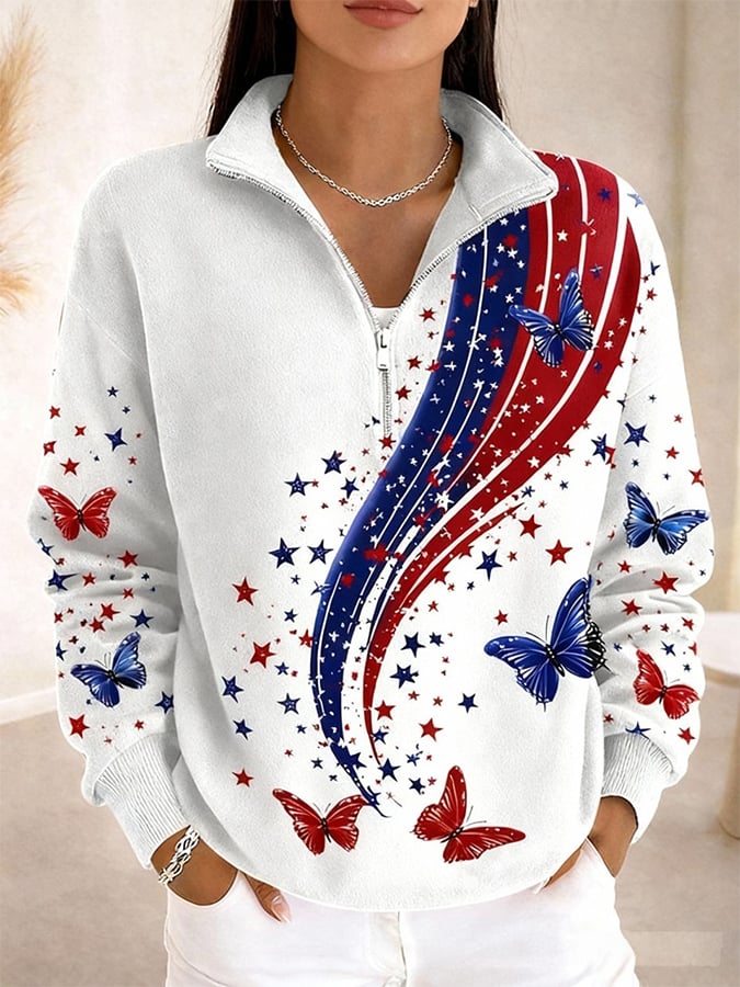 The soft white fleece base features a vibrant, swirling red, white, and blue flag-inspired print that cascades across the chest, surrounded by fluttering butterflies and scattered stars. The quarter-zip collar adds a sporty touch, while the fleece lining ensures warmth and comfort on cooler days. It’s a bold yet romantic way to honor America’s 250-year legacy.